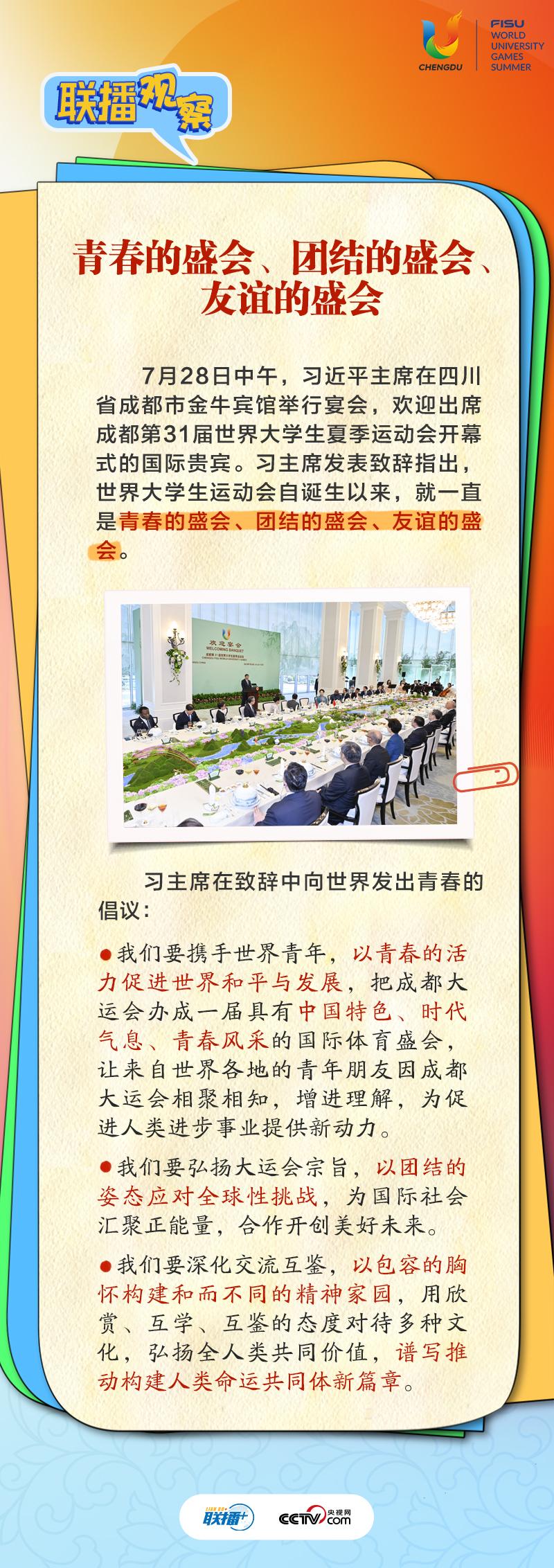 联播+7月28日晚,第31届世界大学生夏季运动会开幕式在四川省成都市举行。习近平主席出席开幕式并宣布本届大运会开幕。