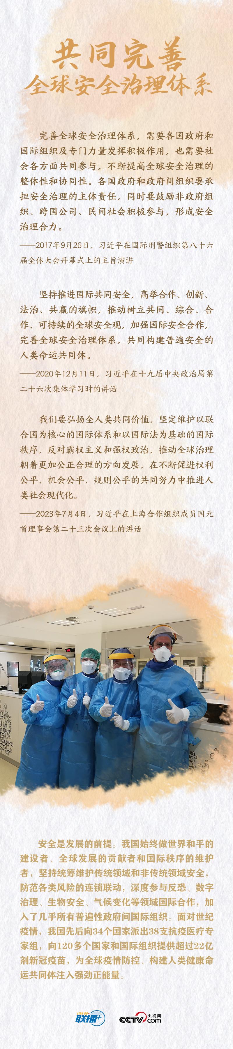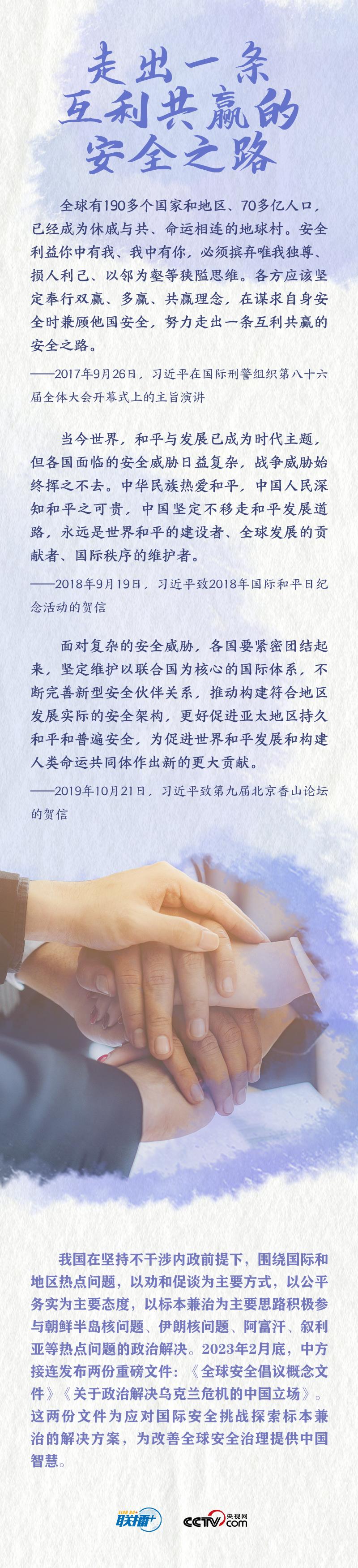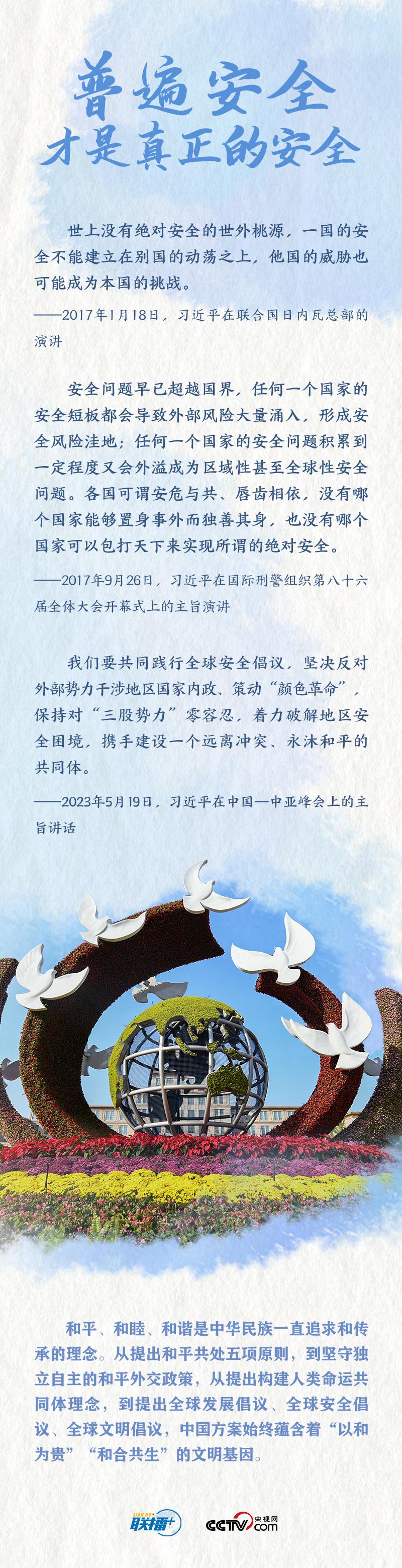 联播+ 从2014年在亚信第四次峰会上提出亚洲安全观,到2016年在二十国集团杭州峰会期间阐述中国的新安全观,从2017年在联合国日内瓦总部阐述如何建设持久和平、普遍安全的世界,到2022年提出全球安全倡议,习近平主席深刻洞察世界发展大势,不断发展和完善具有中国特色的安全理念,为破解全球安全困境指明前进方向、明确合作路径。