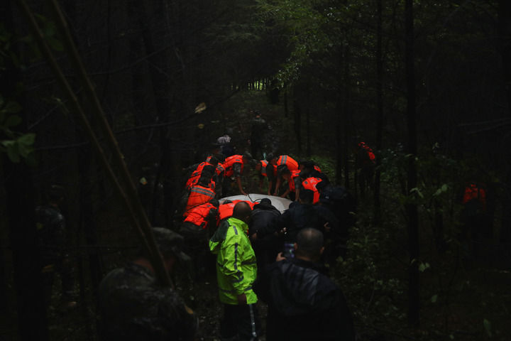 ↑8月7日,武警黑龙江总队牡丹江支队官兵正穿过密林准备将冲锋舟抬至海浪河岸边。新华社发(刘飞 摄)