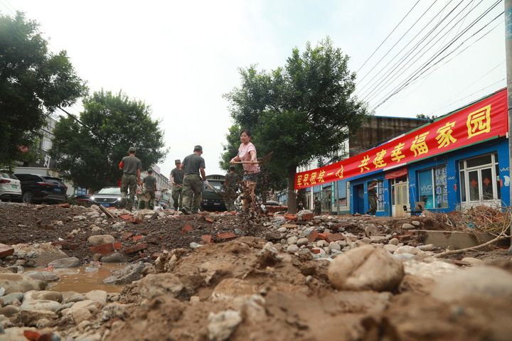 ↑8月7日,武警河北总队机动支队官兵在涿州朝阳大街搬运垃圾、清淤清泥、冲洗街道。新华社发 (赵佳亮 摄)