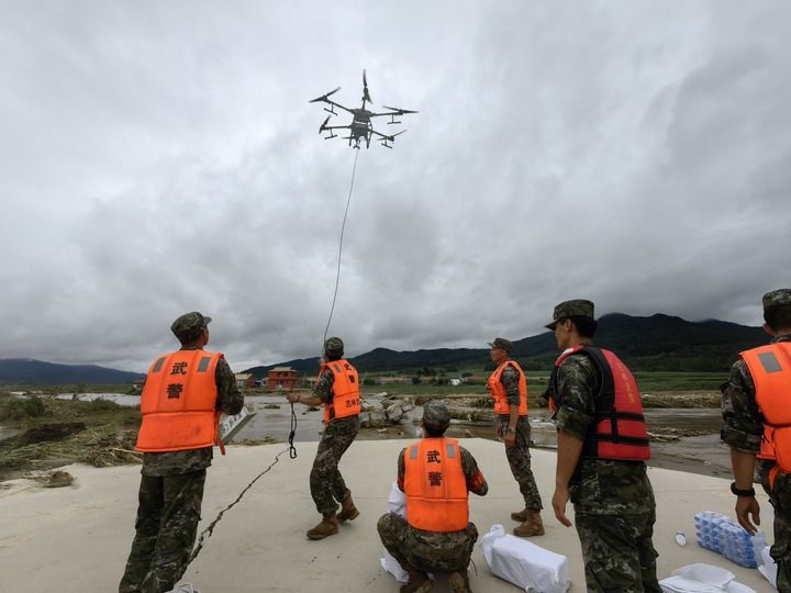 ↑武警吉林总队吉林支队官兵利用无人机向舒兰市开原镇五滴村小乡屯90余名被洪水围困的群众空投食品和饮用水(8月6日摄)。新华社发(曹孟泽 摄)