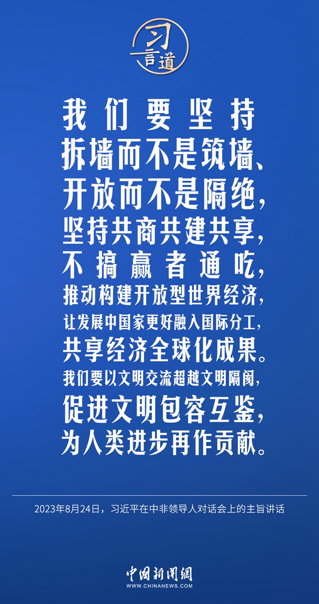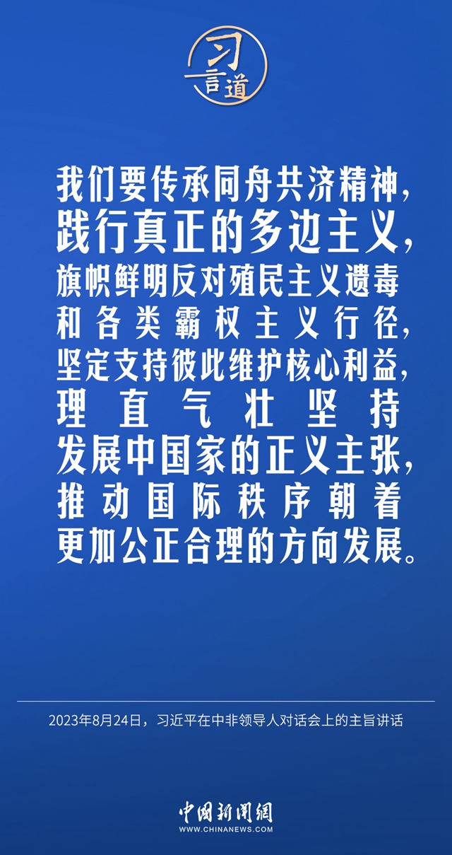 当地时间8月24日晚,国家主席习近平和南非总统拉马福萨在约翰内斯堡共同主持中非领导人对话会。习近平发表题为《携手推进现代化事业 共创中非美好未来》的主旨讲话。习近平指出——