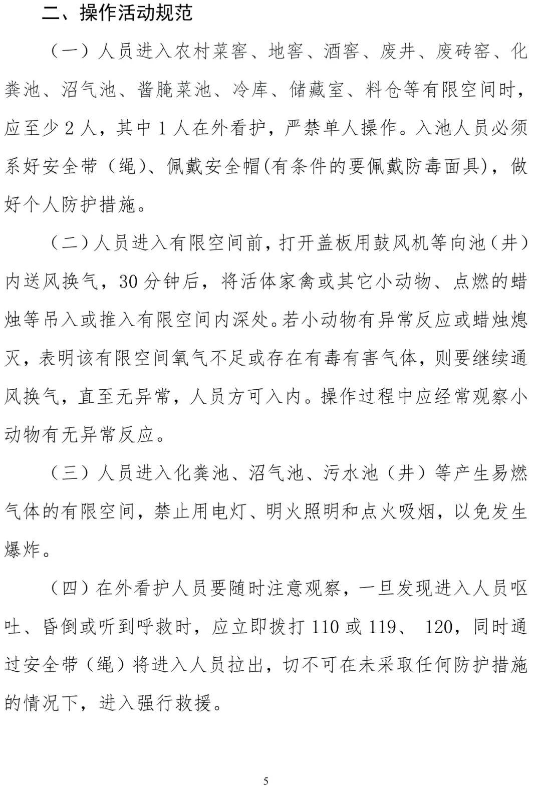 各县(市、区)要结合各自实际,采取制发宣传品、微信抖音、入户宣传等形式,加大对农村有限空间作业内容、危害因素、防范措施和自救互救知识的宣传教育普及力度。特别是对进入菜窖、地窖、酒窖、化粪池、沼气池、酱腌菜池、冷库、储藏室、料仓等有限空间作业的,要遵循“先通风、再检测、后作业”的原则,加大宣传力度,做到家喻户晓、人人皆知。同时,安全应急、农业农村、粮食流通加工等行业管理部门要将农村有限空间作业纳入宣传培训重要内容,统筹各方资源,帮助指导乡镇(街道)、相关生产经营主体,组织村组农户、从业人员开展专题培训,进一步掌握有限空间作业操作规定和防范措施,提高有限空间作业安全防范的意识和能力。坚决杜绝农村偏远地区群众因安全防范意识不足、施救措施不当等造成群死群伤事件发生。