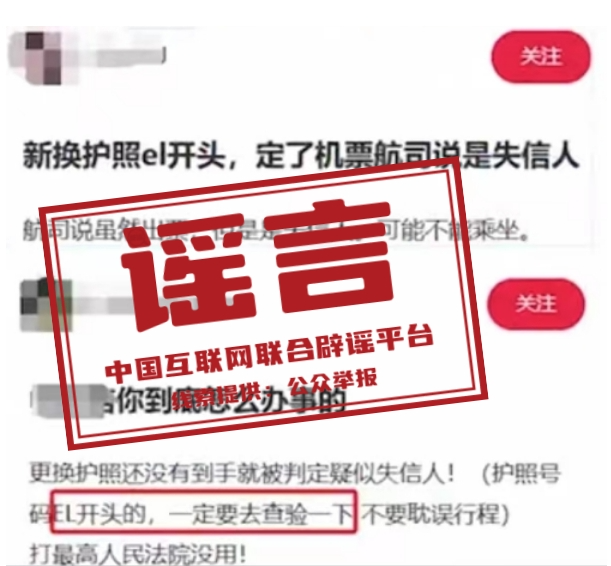 真相:国家移民管理局回应称,网传“护照号码EL开头为失信人员”纯属谣传。护照系我国公民出入国境和在国外证明国籍、身份的证件,普通护照号码共9位,由1位英文字母+8位阿拉伯数字按顺序组成。2012年我国启用电子普通护照后,首位英文字母由“G”调整为“E”,代表电子护照含义。随着普通护照签发量增加,前缀英文字母调整为2位,由E+1位英文字母组成,英文字母从A至Z顺延,其中字母I、O除外。公安机关出入境管理机构审批普通护照申请后,按顺序自动匹配空白护照打印制作。因此,申请人所持护照号码具有随机性。(来源:国家移民管理局、环球网)