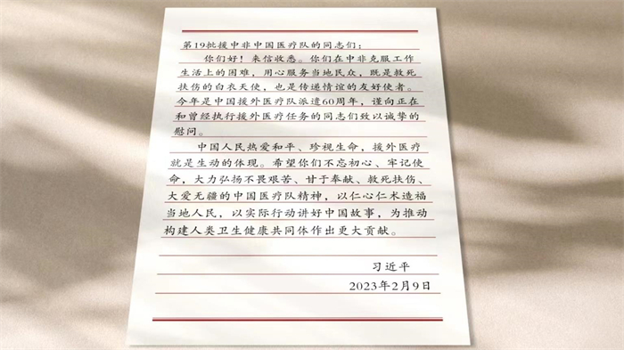 时隔10年,2023年2月,习近平主席在给第19批援中非共和国中国医疗队队员回信时,再次提到中国医疗队精神。