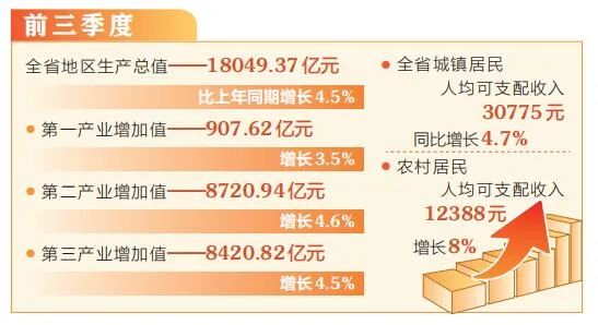 前三季度,第一产业增加值为907.62亿元,增长3.5%;第二产业增加值为8720.94亿元,增长4.6%;第三产业增加值为8420.82亿元,增长4.5%。今年以来,农业生产稳定增长,畜牧业生产增势良好;工业生产平稳增长,新动能不断积蓄;服务业较快增长,互联网领域涨势较好。