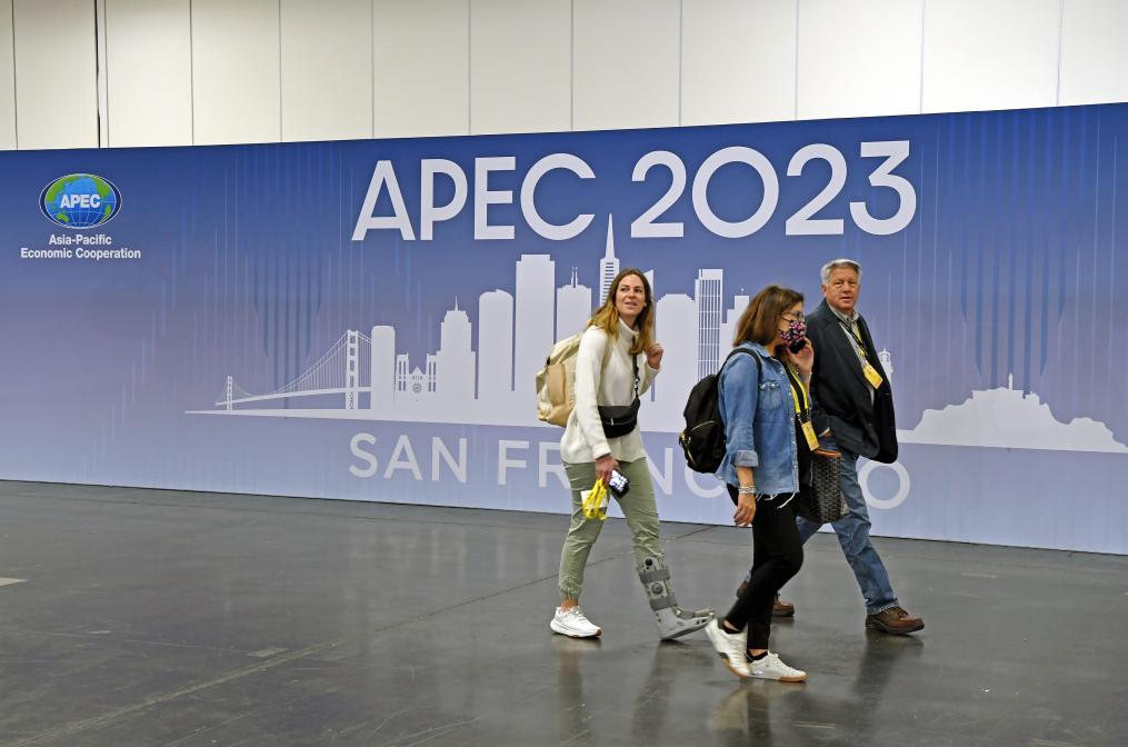 11月12日,在美国旧金山,记者经过2023年亚太经合组织会议国际媒体中心内的一幅海报。新华社记者李睿 摄