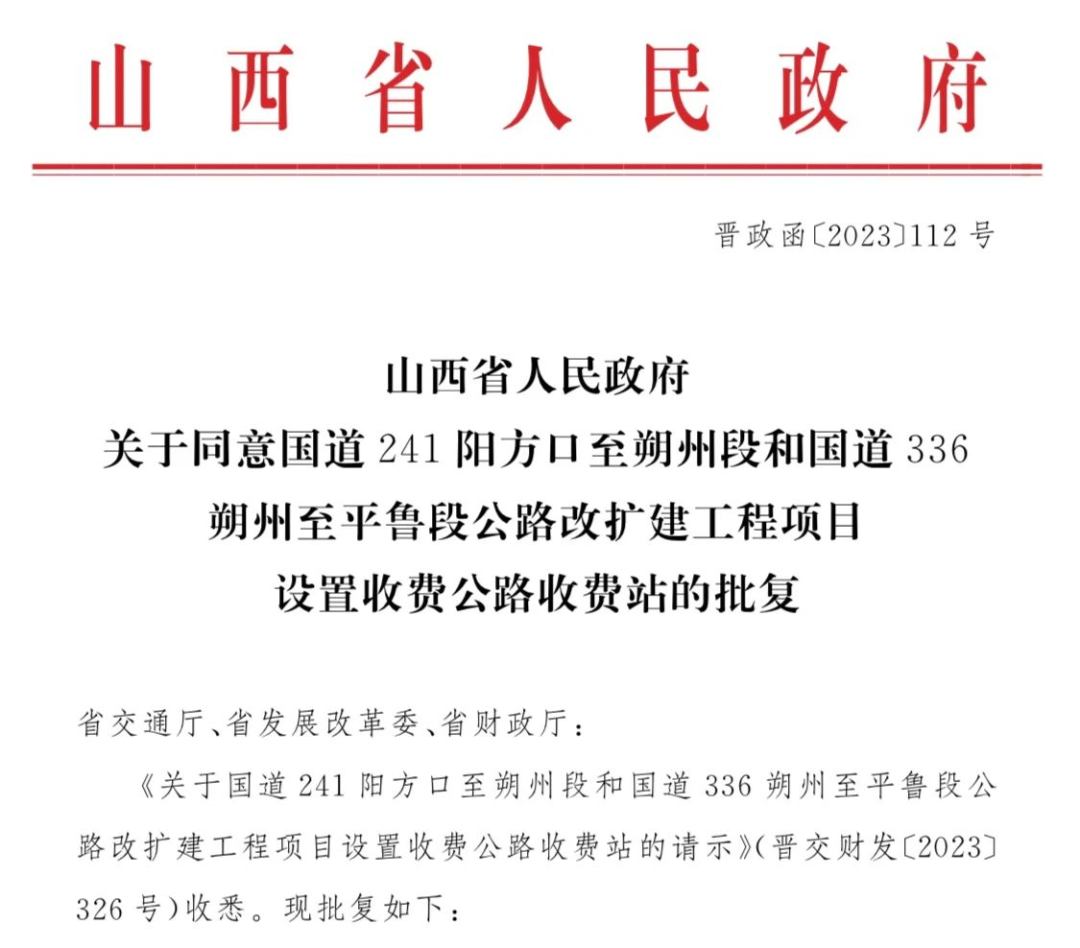 近日,山西省人民政府发布“关于同意国道241阳方口至朔州段和国道336朔州至平鲁段公路改扩建工程项目设置收费公路收费站的批复”。