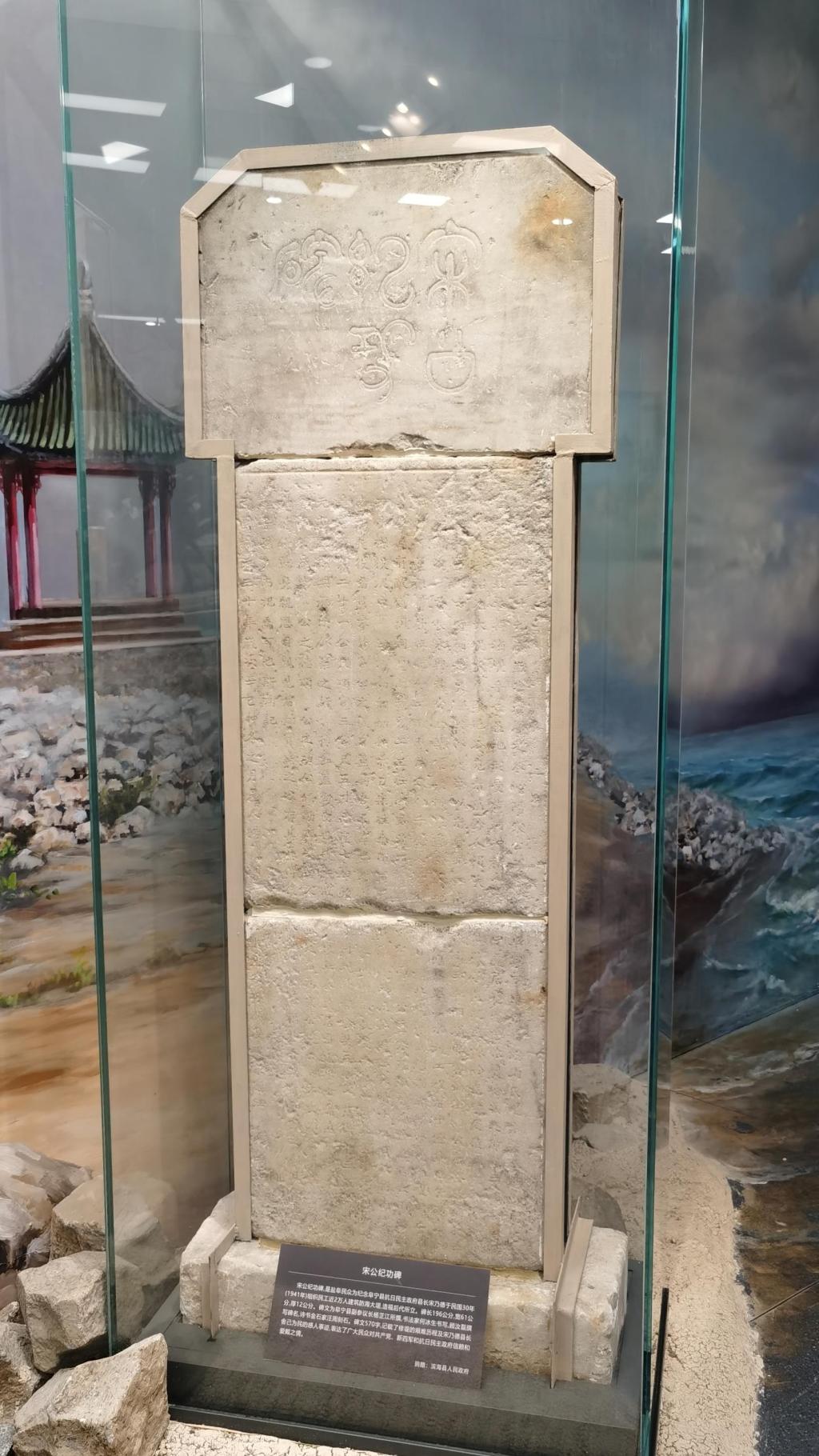 △新四军纪念馆里的宋公纪功碑。此碑是盐阜民众为纪念阜宁县抗日民主政府县长宋乃德于1941年组织修筑海防大堤所立。碑文记载了修筑大堤的艰难历程,表达了盐阜民众对共产党、新四军和抗日民主政府的信赖和爱戴之情。(总台央视记者郭鸿拍摄)