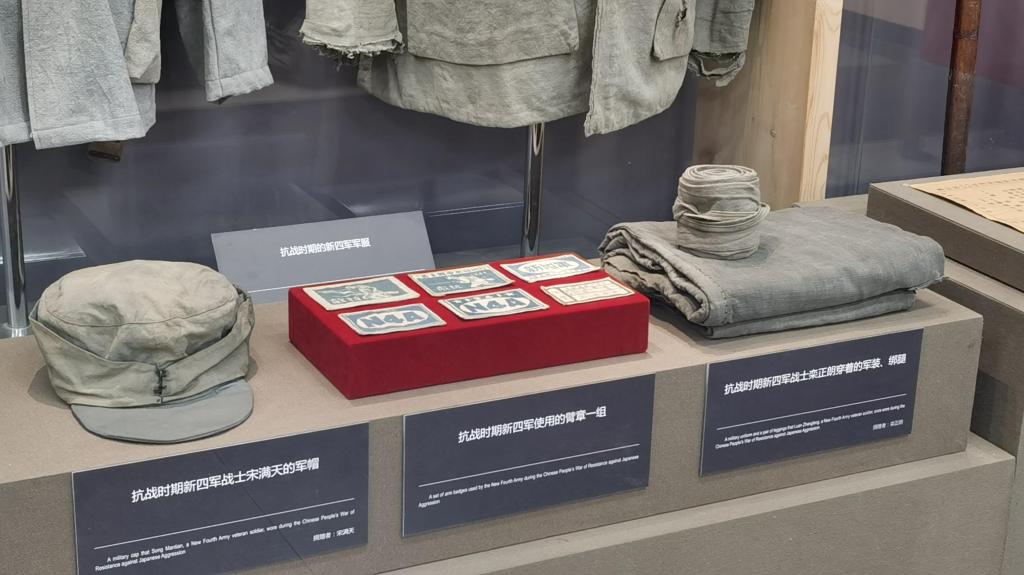 △抗战时期新四军使用的军帽、臂章等。(总台央视记者郭鸿拍摄)