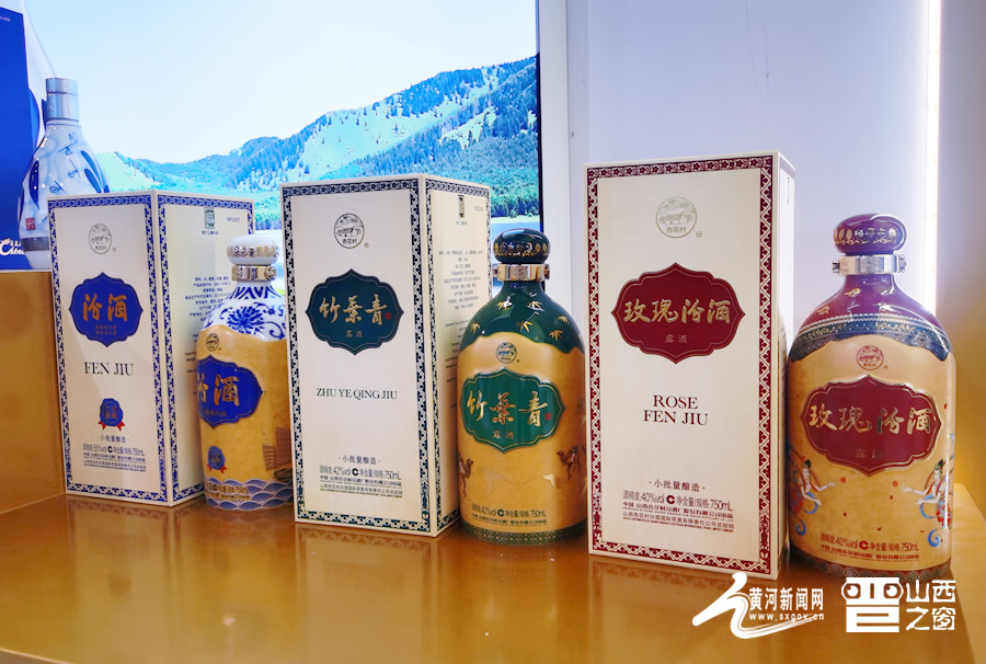 图为跨境电商展区山西展厅内展示的汾酒等展品。