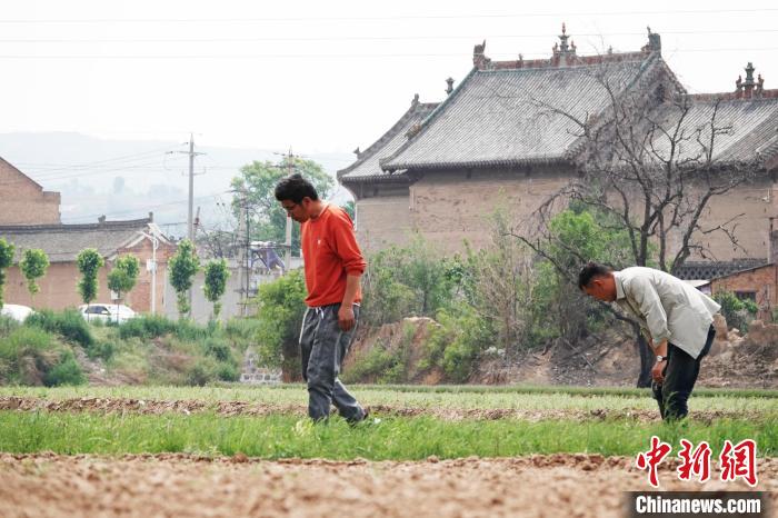 山西省运城市新绛县阳王镇北池村,药农杨齐生(左)和邻里前往田间农忙。高新生摄