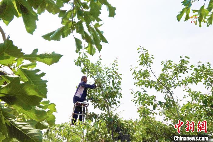 山西省运城市新绛县阳王镇北池村,药农李银喜在修剪管护山楂树。高新生摄