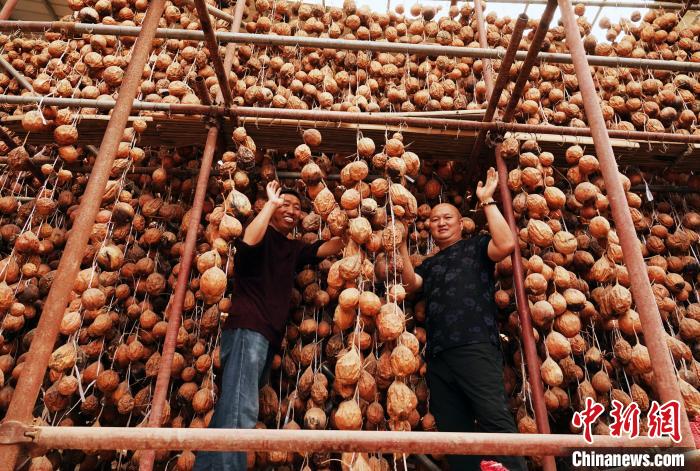 山西省运城市新绛县阳王镇北池村,药材种植大户杨春林(右)和邻里晾晒中药材瓜娄。高新生摄