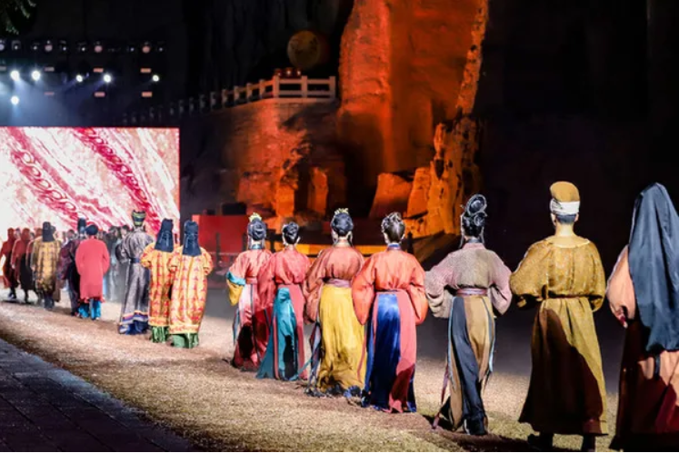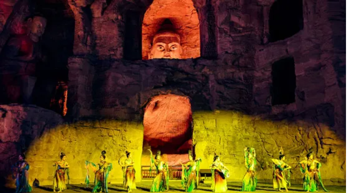 云冈石窟“又见云冈”大型实景艺术秀表演。新华社发