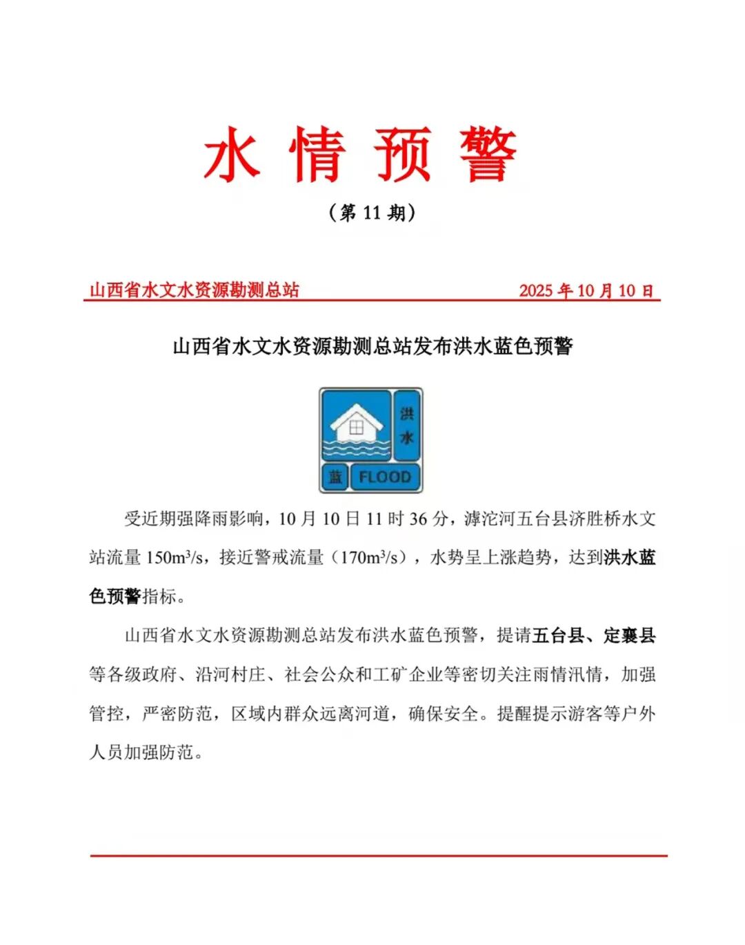 山西省水文水资源勘测总站发布洪水蓝色预警,提请五台县、定襄县等各级政府、沿河村庄、社会公众和工矿企业等密切关注雨情汛情,加强管控,严密防范,区域内群众远离河道,确保安全。提醒提示游客等户外人员加强防范。
