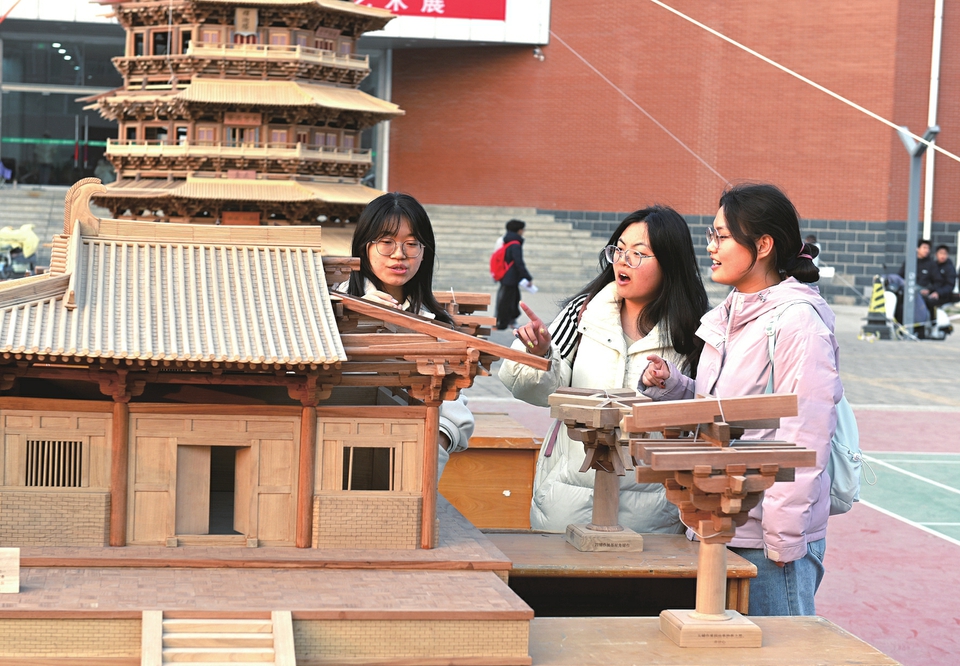12月10日,山西师范大学内,“一眼千年·遇见山西古建艺术”户外主题展览吸引众多师生前来观展。展览将应县木塔、佛光寺、南禅寺、晋祠圣母殿等一批精美的山西传统建筑模型搬进大学校园,让师生在近距离接触中感受三晋文明的独特魅力。(王若渊 摄)