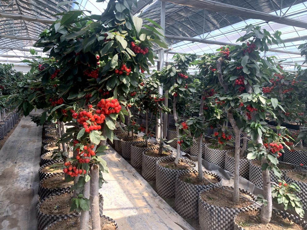 走进樱桃大棚,一串串如红色玛瑙般的果实挂满枝头,色彩鲜艳、果香诱人。负责樱桃大棚栽种的技术员赵友说,目前这里已经建设4座全智能连栋薄膜大棚、2座冷棚和200亩大田,种了5.3万株“美早”大樱桃。通过实施高新栽培技术种植和管理,樱桃挂果期从每年4月持续到7月,市场销售供不应求。