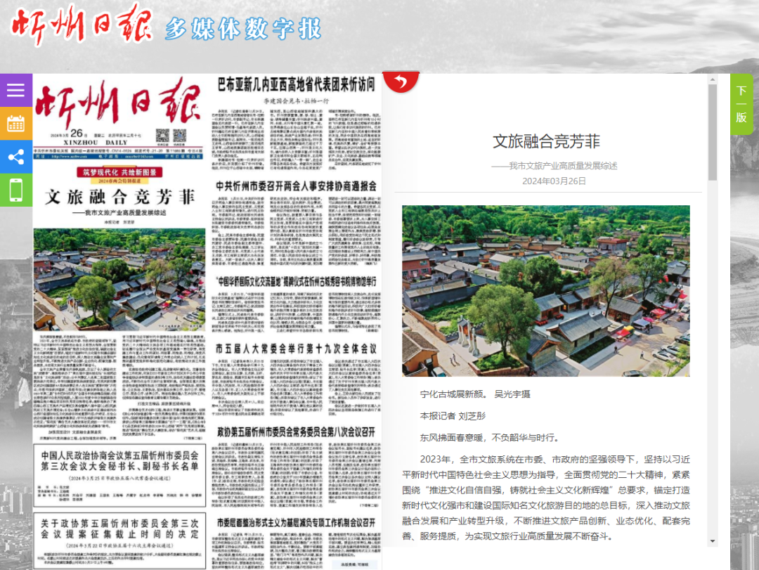 全市文旅产业乘着东风扬帆起航,交出了令人振奋的文旅“成绩单”:高规格举办了“第五届中国长城论坛‘长城两边是故乡’文化旅游季”活动;云中河景区入选第二批国家级文明旅游示范单位,申报创建国家级旅游度假区;岢岚宋家沟景区成功创建国家4A级旅游景区并入选文旅部“夏季村晚”示范点;市图书馆获评国家二级图书馆;定襄农耕体验之旅入选2023年第二期“乡村四时好风光”全国乡村旅游精品线路;《馆长带您读忻州》系列短视频,入围2023年度中华文物新媒体传播精品推介精品项目和优秀项目推荐名单;高标准承办了第四届山西工艺美术产品博览交易会暨第八届中国(山西)民族民间工艺美术博览会;五台山慧养文化旅游片区建设被列为山西打造国际知名文化旅游目的地重要内容;忻府区、五台山成功创建省级文旅康养集聚区;忻州古城获评省级文旅康养示范区;“梨花奖”舞台艺术大赛改革初见成效……忻州市文化和旅游局荣获“山西省文化和旅游系统先进集体”称号。