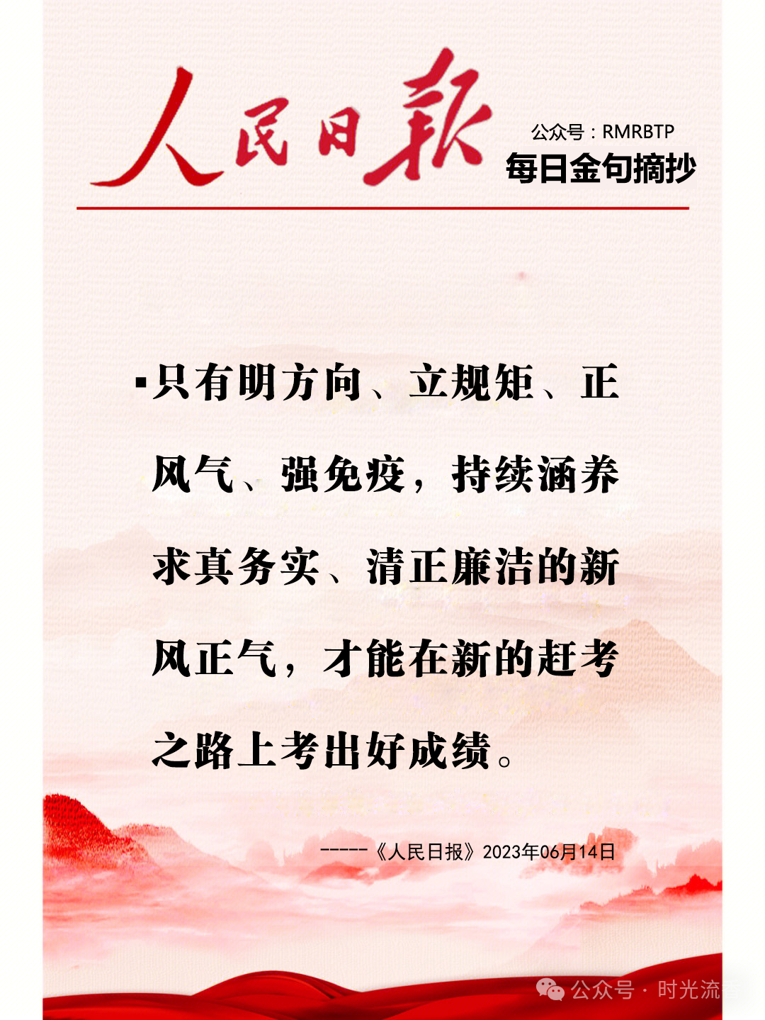💎只有明方向、立规矩、正风气、强免疫,持续涵养求真务实、清正廉洁的新风正气,才能在新的赶考之路上考出好成绩。----《人民日报》2023年06月14日