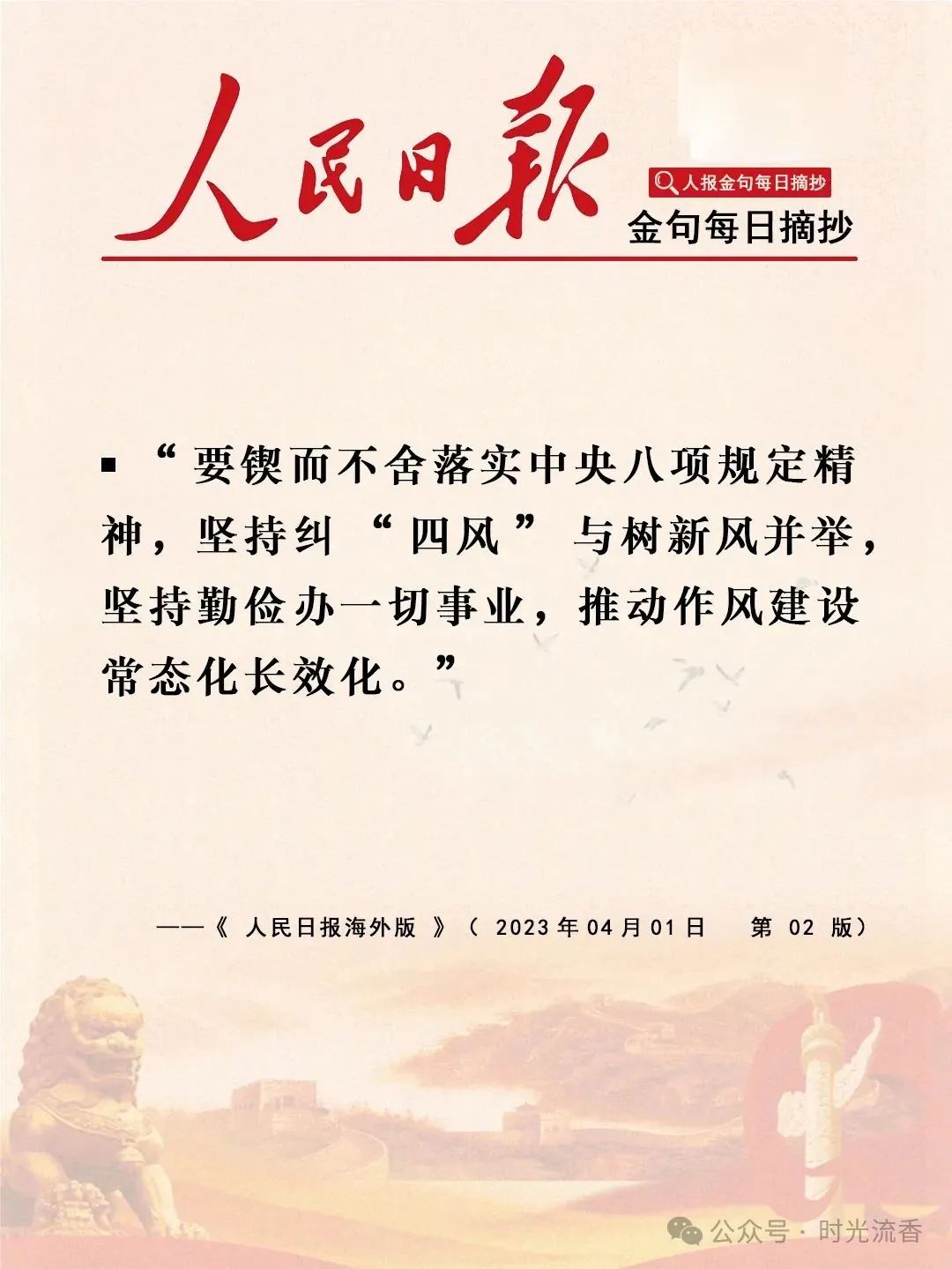 💎要锲而不舍落实中央八项规定精神,坚持纠“四风”与树新风并举,坚持勤俭办一切事业,推动作风建设常态化长效化。——《 人民日报海外版 》( 2023年04月01日 第 02 版