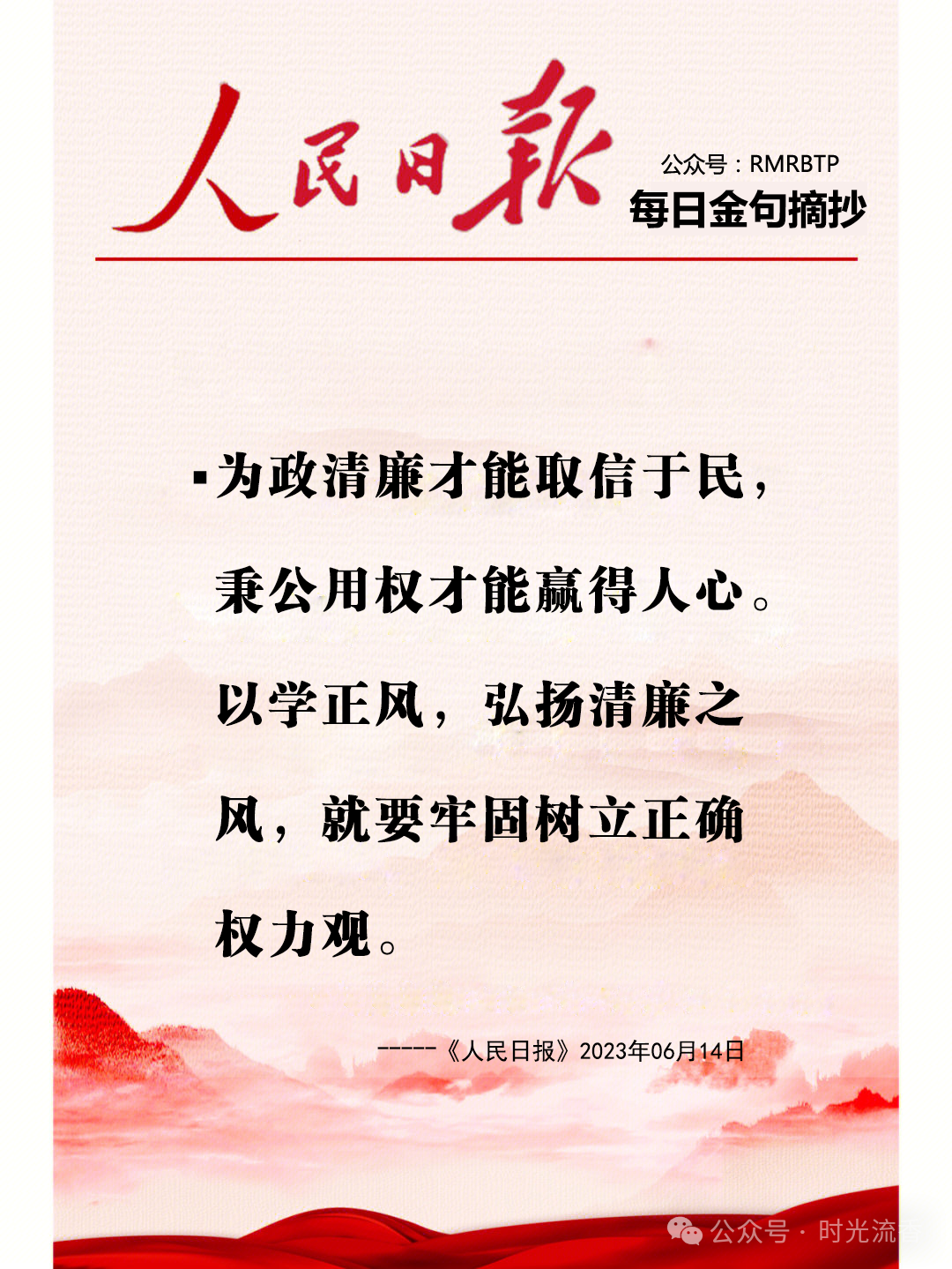 💎为政清廉才能取信于民,秉公用权才能赢得人心。以学正风,弘扬清廉之风,就要牢固树立正确权力观。----《人民日报》2023年06月14日