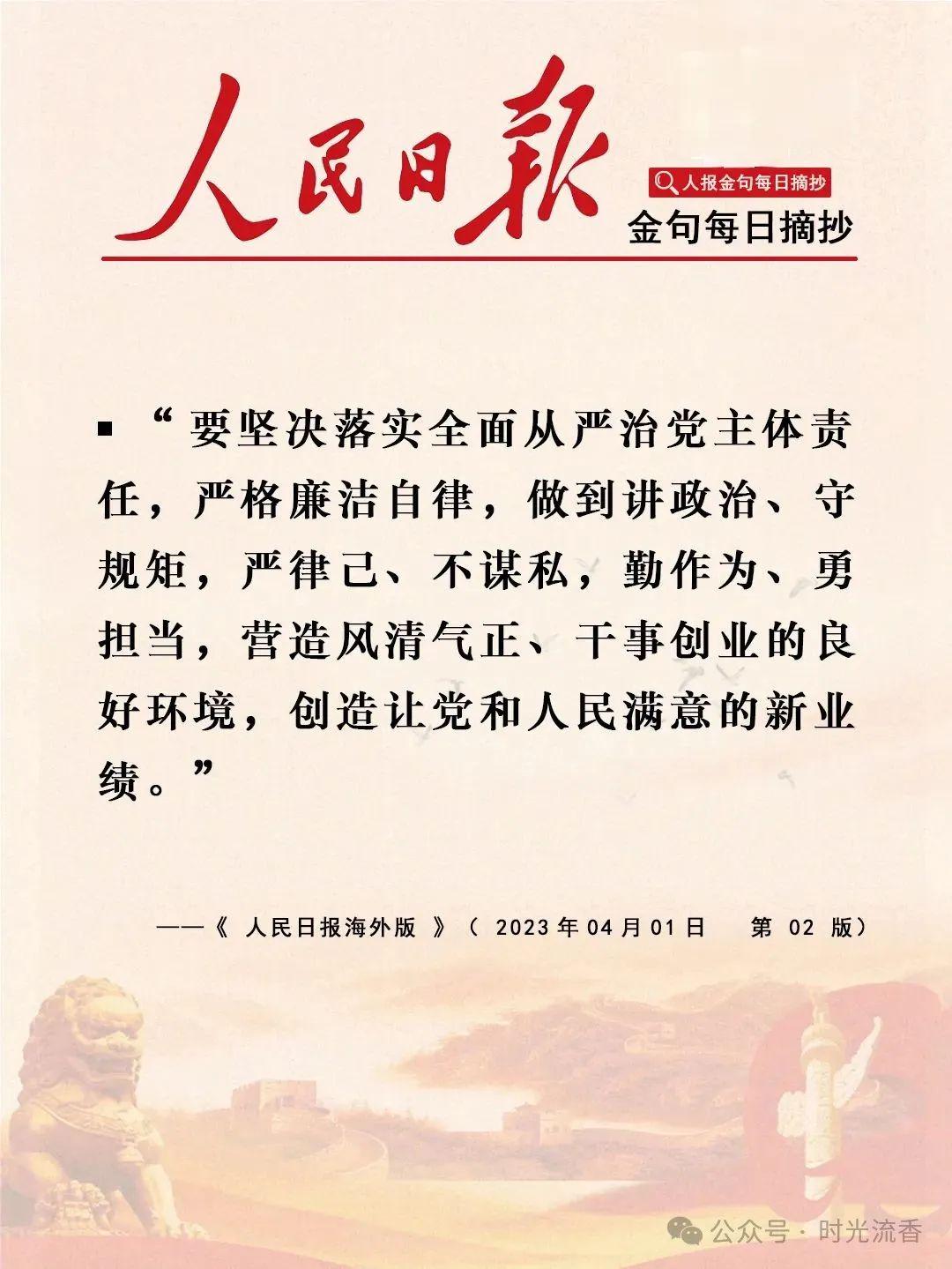 💎为政清廉才能取信于民,秉公用权オ能赢得人心。要坚决落实全面从严治党主体责任,严格廉洁自律,做到讲政治、守规矩,严律己、不谋私,勤作为、勇担当,营造风清气正、干事创业的良好环境,创造让党和人民满意的新业绩。 ——《 人民日报海外版 》( 2023年04月01日 第 02 版)