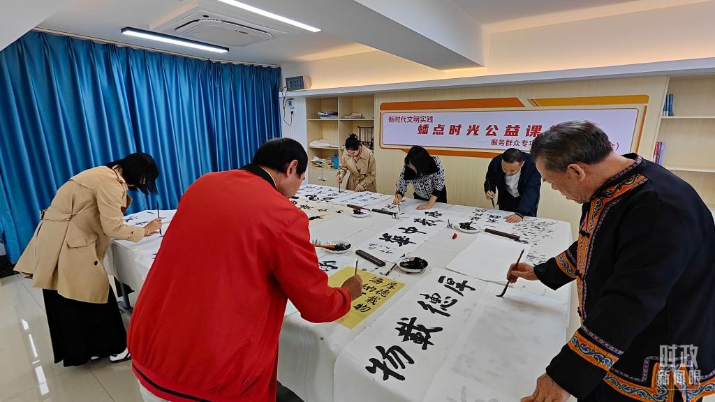 △广西南宁市多民族社区——盘龙社区居民练习书法。(总台央视记者杨立峰拍摄)