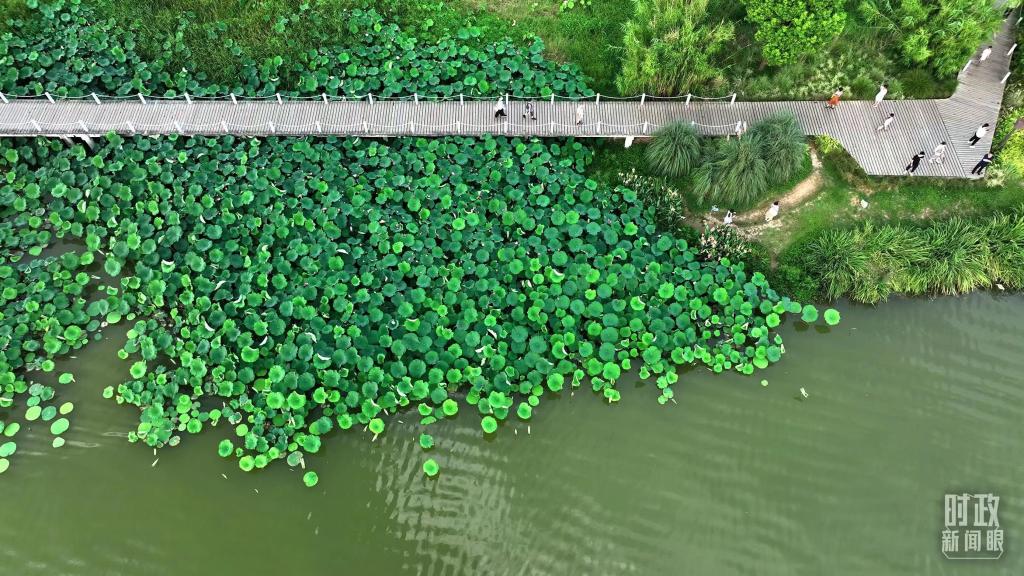 △陕西汉中天汉湿地公园内,游人穿行,荷影婆娑。(总台记者刘海涛拍摄)