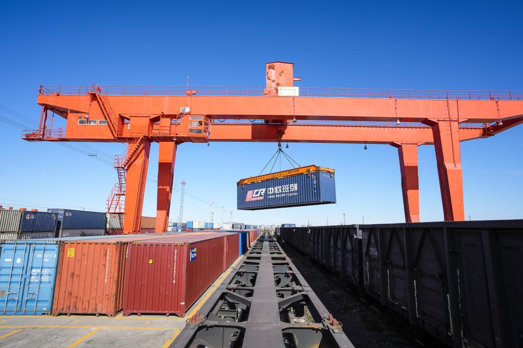 △ 内蒙古锡林郭勒二连浩特口岸铁路货场内,龙门吊正在吊装中欧班列集装箱。