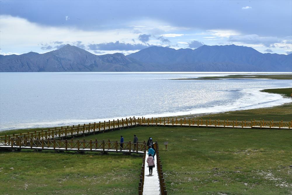 △ 游客行走在青海玛多县冬格措纳湖畔的木栈道上。