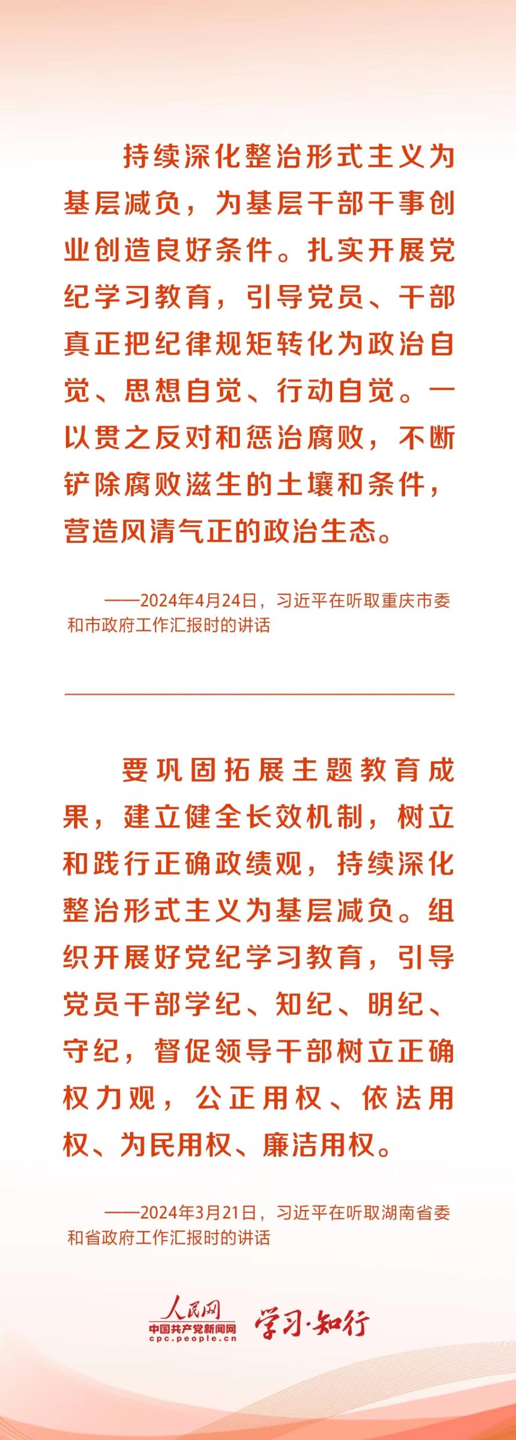 在新时代推动西部大开发座谈会上,习近平再次明确,“巩固拓展主题教育成果,抓好党纪学习教育,持续整治形式主义为基层减负。”