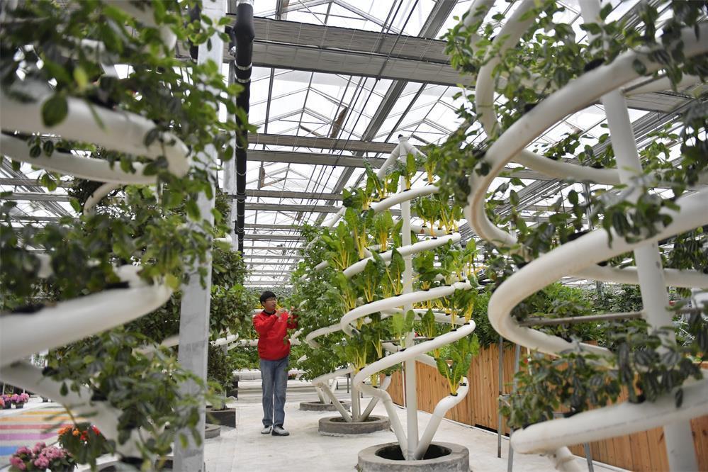 △2023年5月13日,在河北曲周县育苗产业园,苗乐园科技小院的学生在查看无土栽培蔬菜。