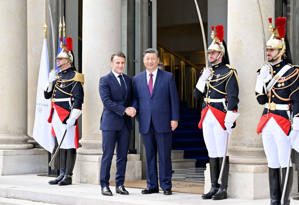 当地时间5月6日上午,国家主席习近平应邀在巴黎爱丽舍宫同法国总统马克龙、欧盟委员会主席冯德莱恩举行中法欧领导人三方会晤。这是习近平同马克龙握手。新华社记者 殷博古 摄