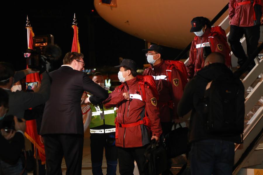 中国医疗团队在贝尔格莱德尼古拉·特斯拉机场降落时已是深夜。武契奇率领塞方多名高级官员到机场迎接。疫情期间不建议握手,于是这位塞尔维亚领导人选择和中国专家团成员一一碰肘以示尊重。对中国的及时支援心怀感激,他还在机场亲吻了一面五星红旗。