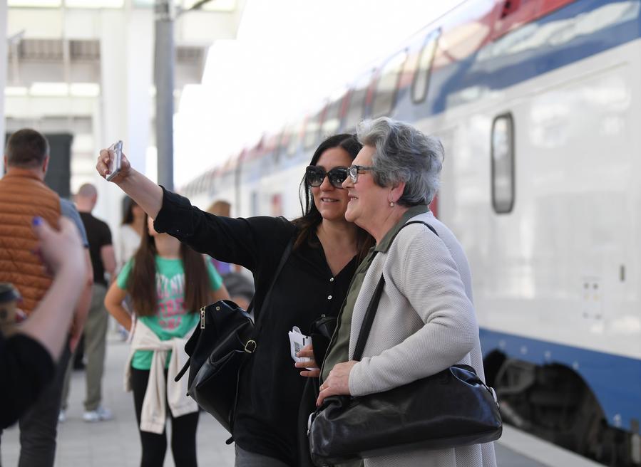 2023年5月6日,在塞尔维亚诺维萨德火车站,乘客在开往贝尔格莱德的列车前自拍。新华社记者任鹏飞摄