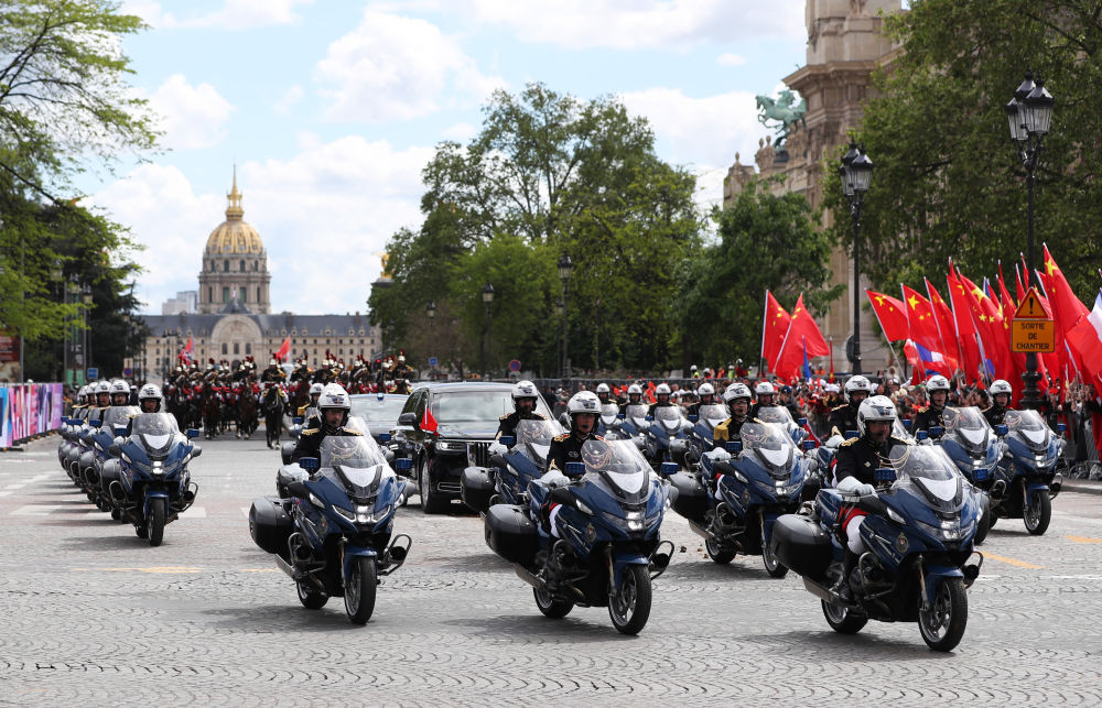 当地时间5月6日下午,正在法国进行国事访问的国家主席习近平在巴黎出席法国总统马克龙举行的隆重盛大欢迎仪式。这是欢迎仪式后,习近平和夫人彭丽媛在共和国卫队148名骑兵组成的礼兵马队和摩托车队护卫下,乘车前往爱丽舍宫。新华社记者 高静 摄