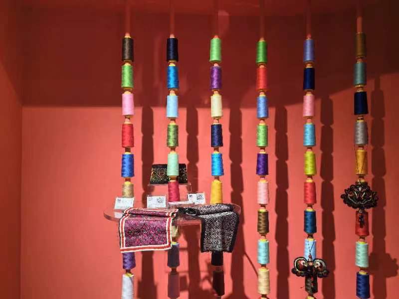 贵州省民族博物馆内展示的色彩斑斓的苗绣原材料及绣片(2024年4月27日摄)。新华社记者 杨欣 摄