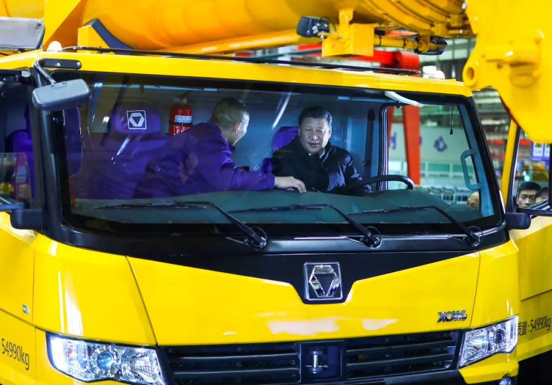 △2017年12月12日,习近平总书记在江苏徐州徐工集团坐进刚下线的XCA220型全地面起重机驾驶室,向技术人员详细询问起重机的性能、产量、价格等。