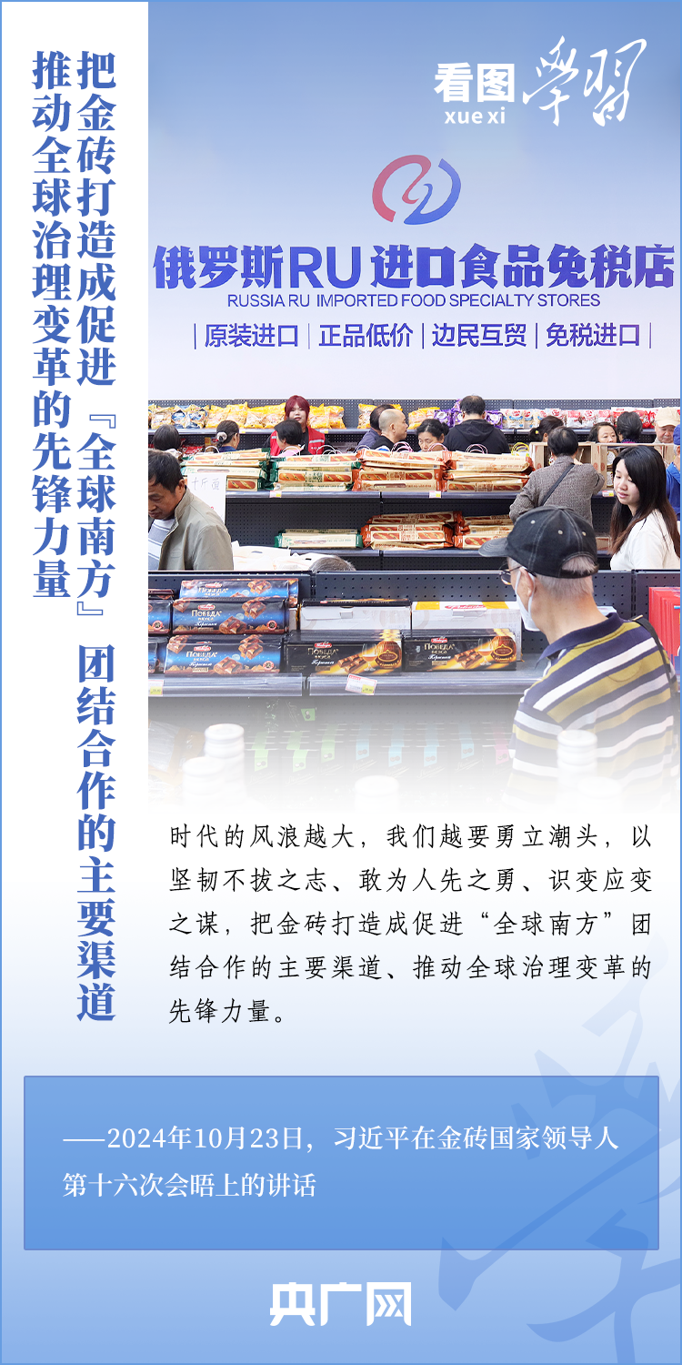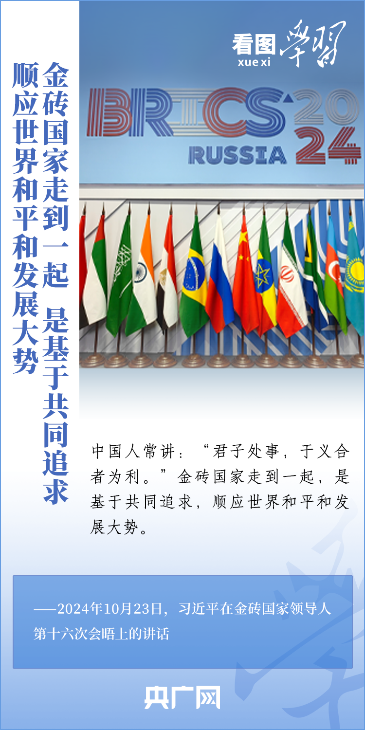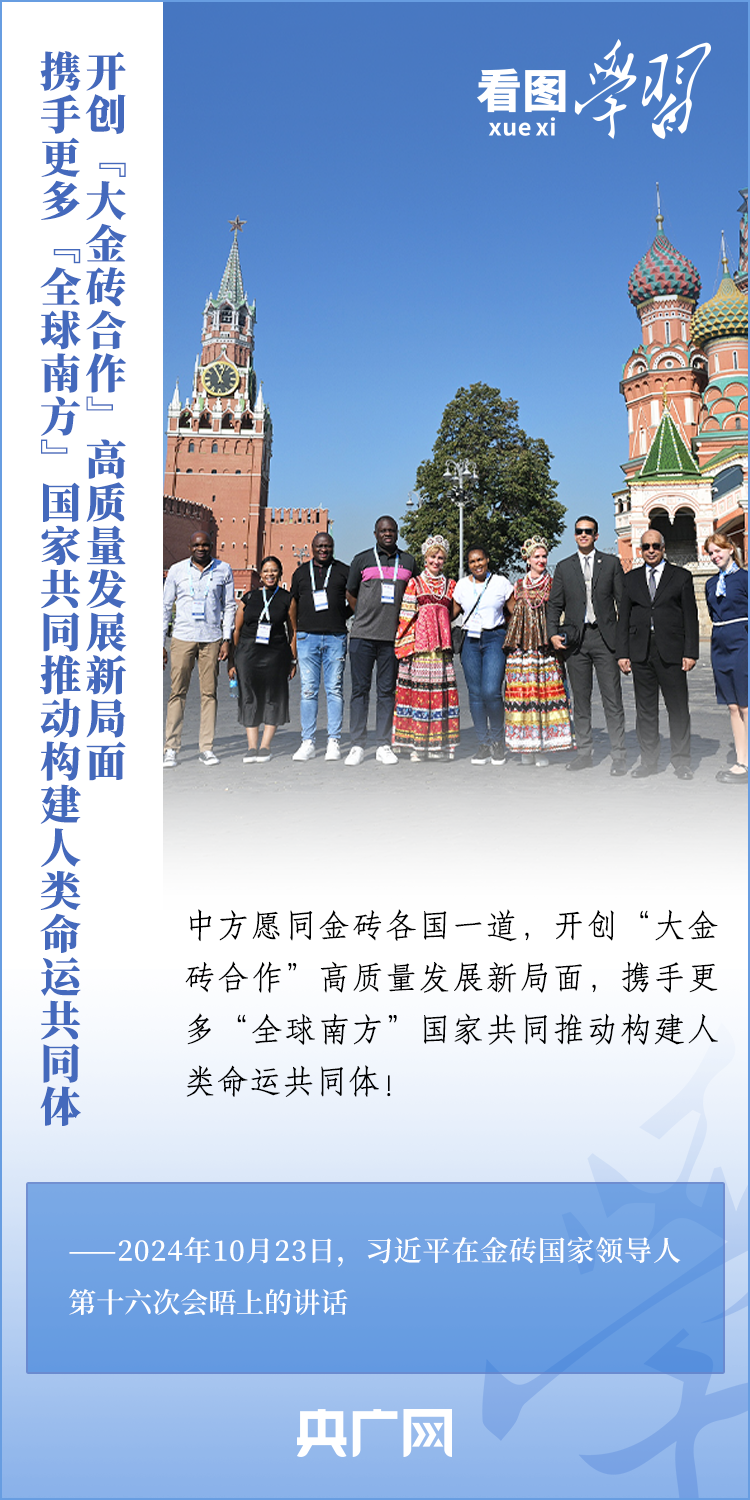 当地时间10月23日,国家主席习近平在俄罗斯喀山出席金砖国家领导人第十六次会晤并发表重要讲话。习主席深刻阐述推动“大金砖合作”高质量发展的中国主张,就金砖大家庭发展合作提出五点务实举措,表达了中方愿同金砖各国一道,携手更多“全球南方”国家共同推动构建人类命运共同体的真诚愿望。一起来学习!